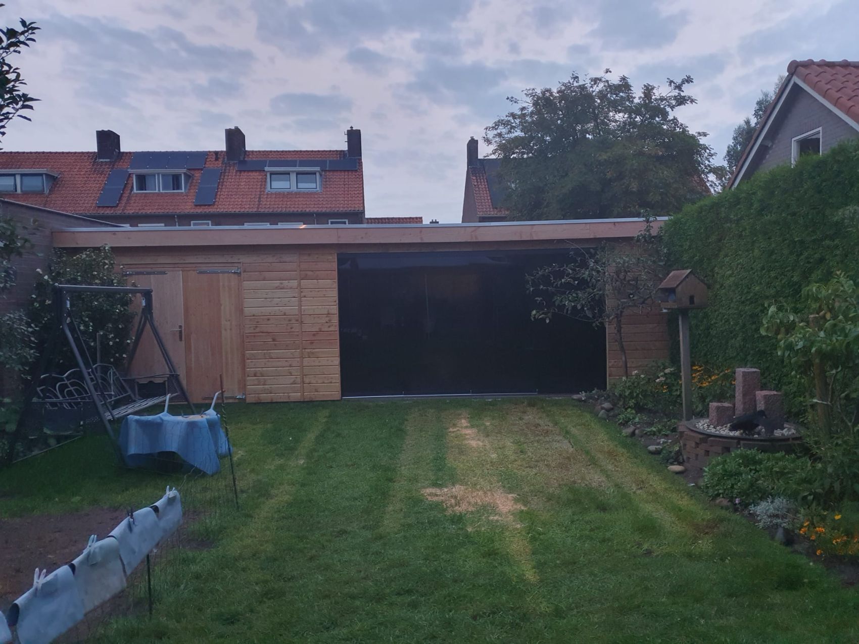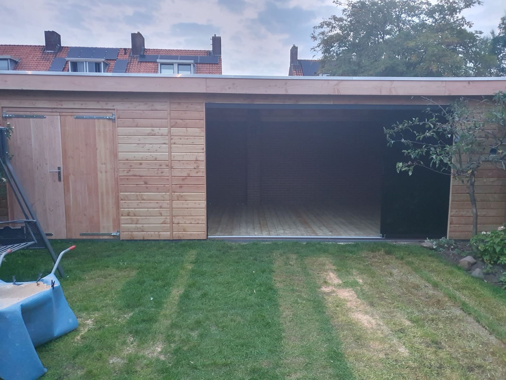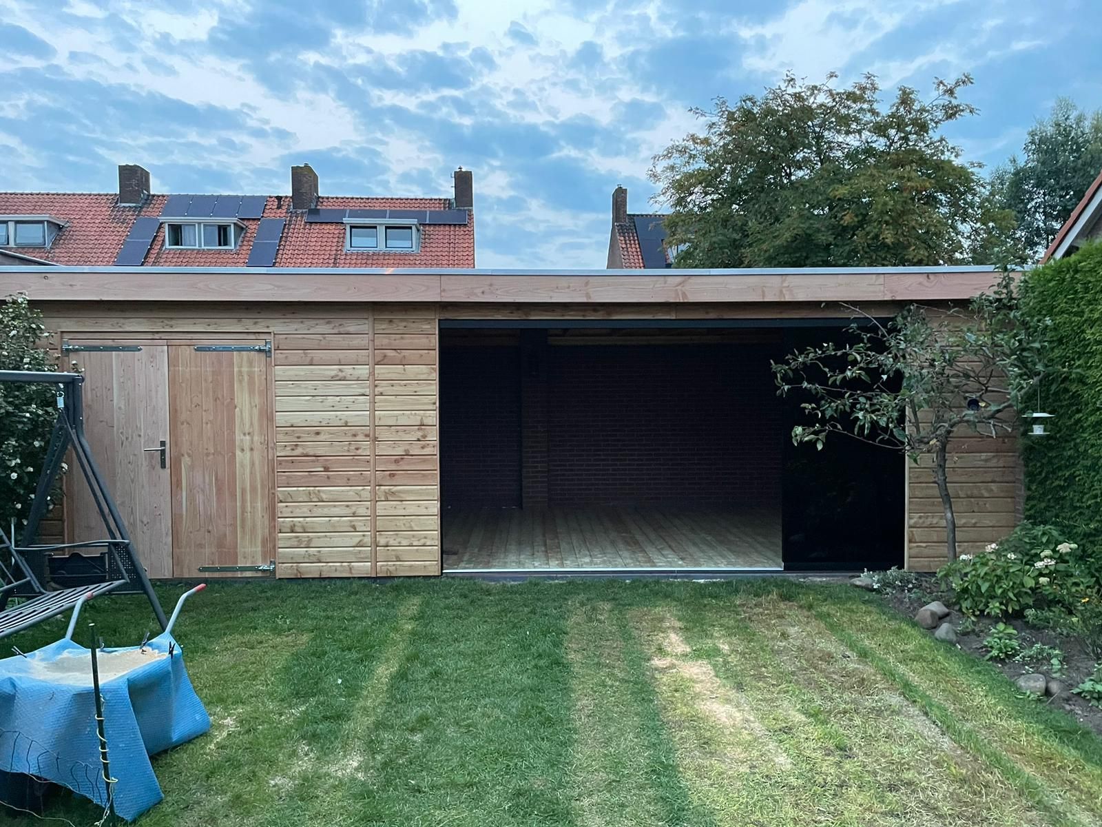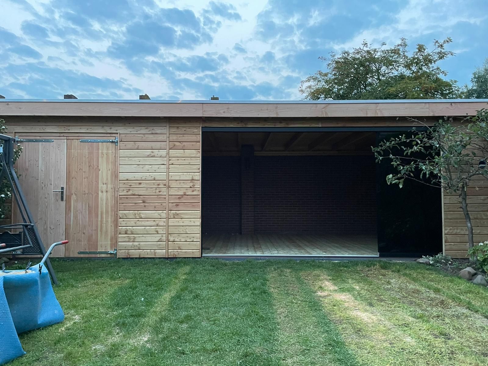 Douglas Overhangend Rabat: De gesloten wanden van de berging zijn bekleed met Douglas overhangend rabat (Zweeds Rabat). Dit zorgt voor een sterke, weersbestendige constructie met een stoere, dekkende en klassieke uitstraling.