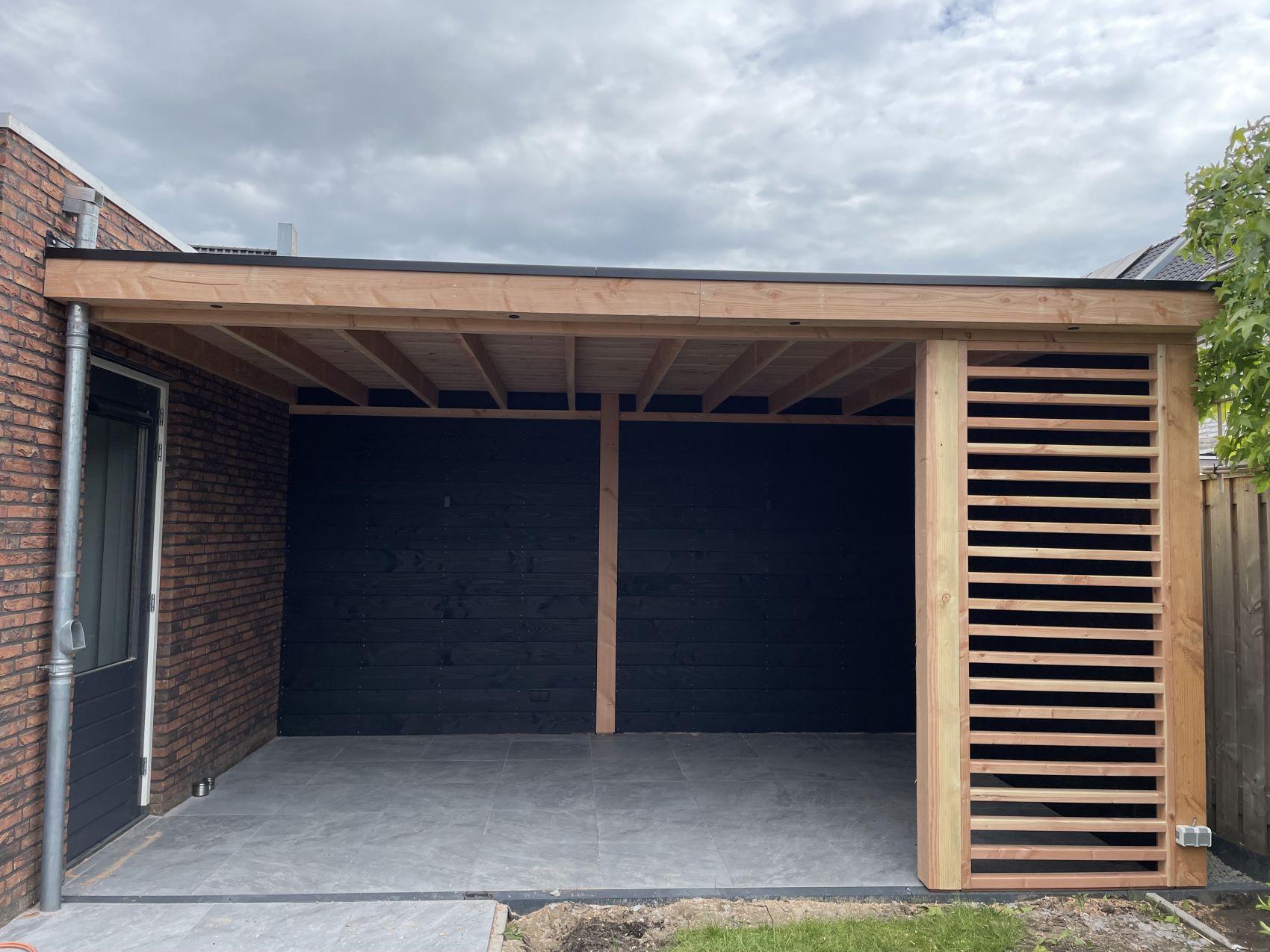 Een robuuste Douglas houten overkapping met plat dak in Zevenaar. Geniet van flexibele zonwering en ventilatie dankzij de verstelbare Douglas lamellen.