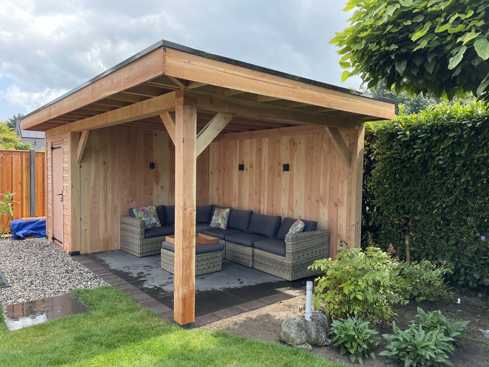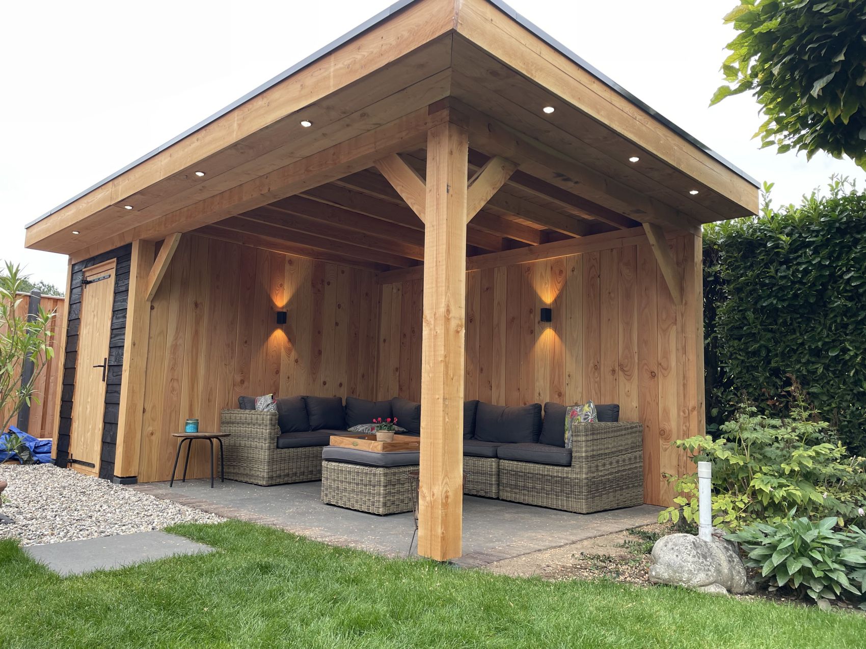 Luxe Douglas Tuinhuis: Stijlvol genieten met overstek en sfeervolle verlichting.