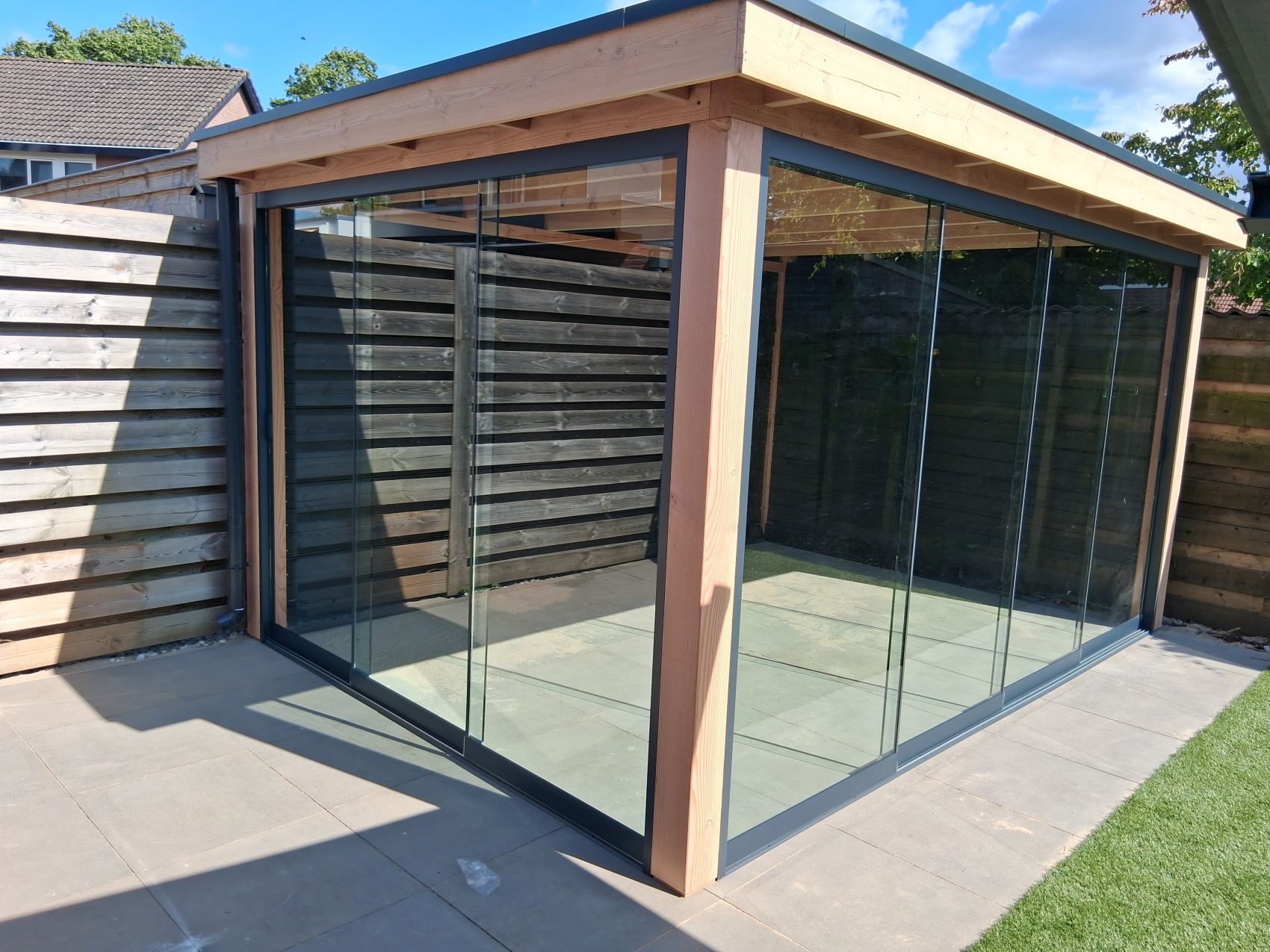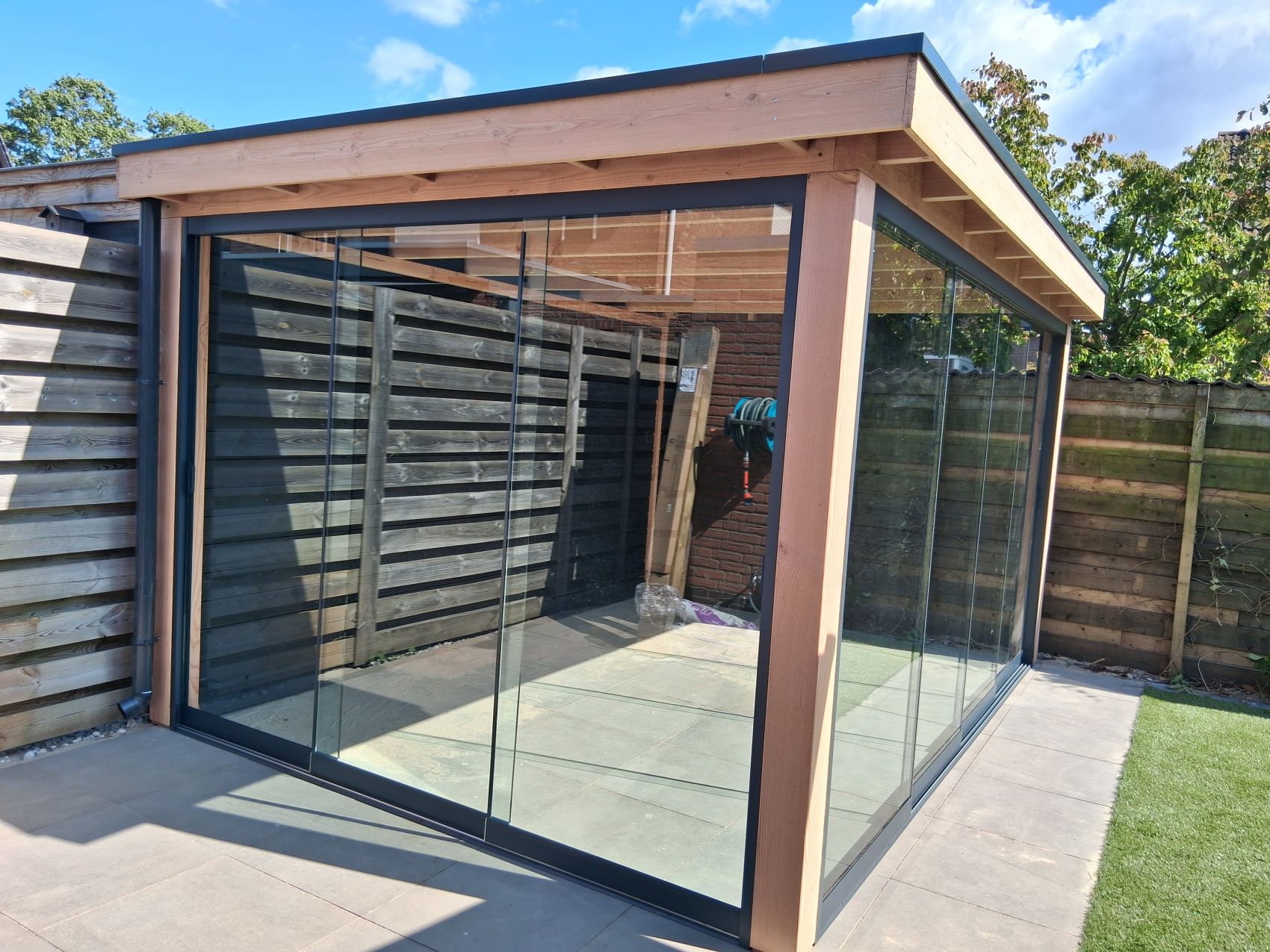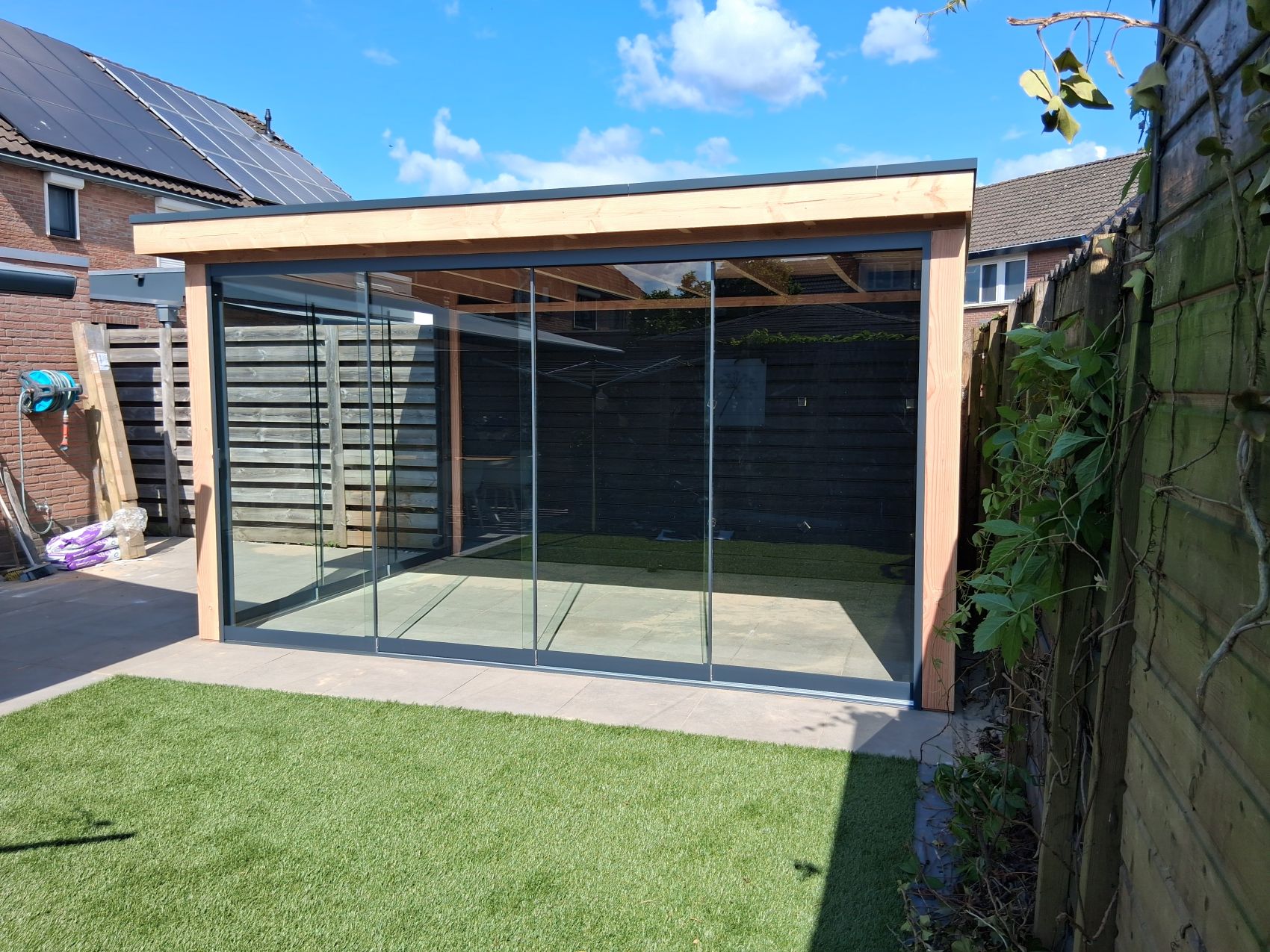 Glazen Schuifwanden: De toevoeging van glazen schuifdeuren transformeert de overkapping tot een wind- en waterdichte leefruimte. Geniet het hele jaar door van uw tuin; u sluit de deuren bij koud weer en schuift ze volledig open op warme dagen.